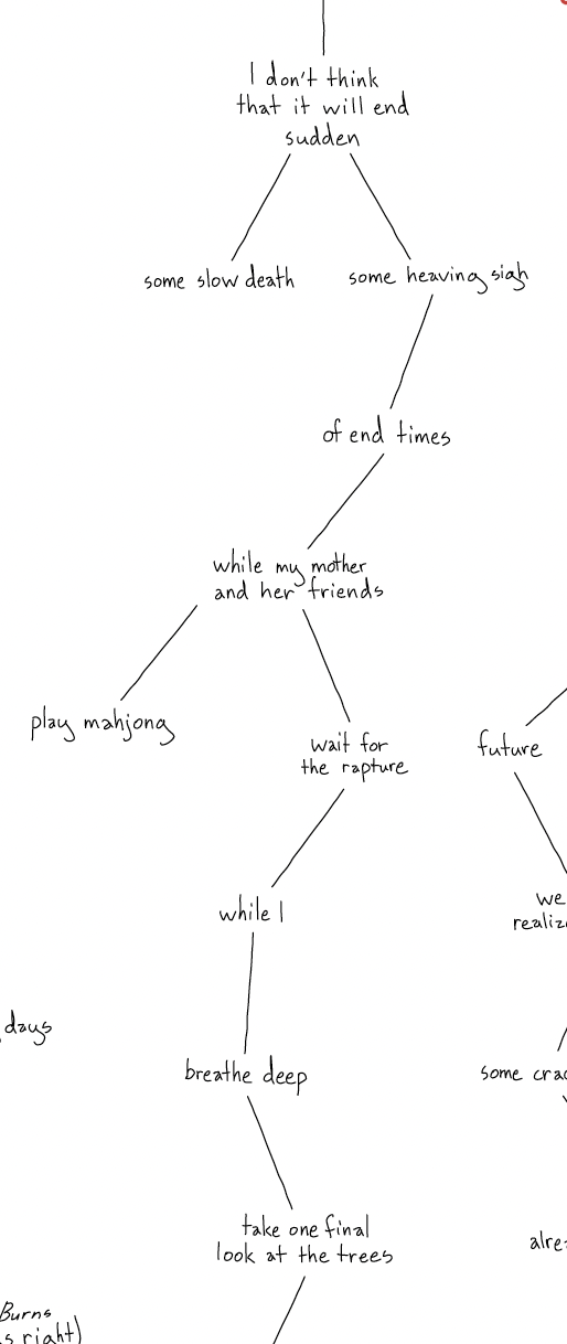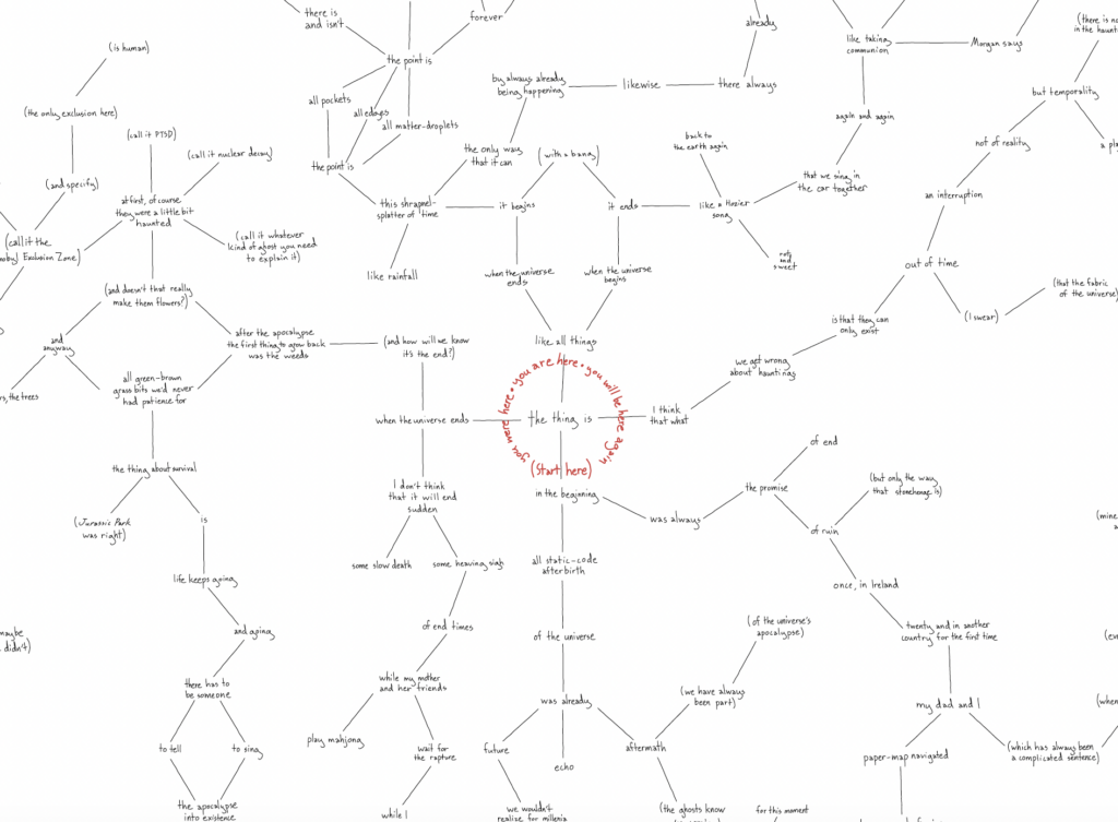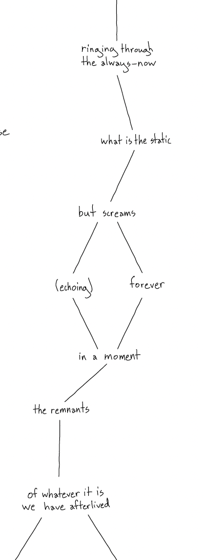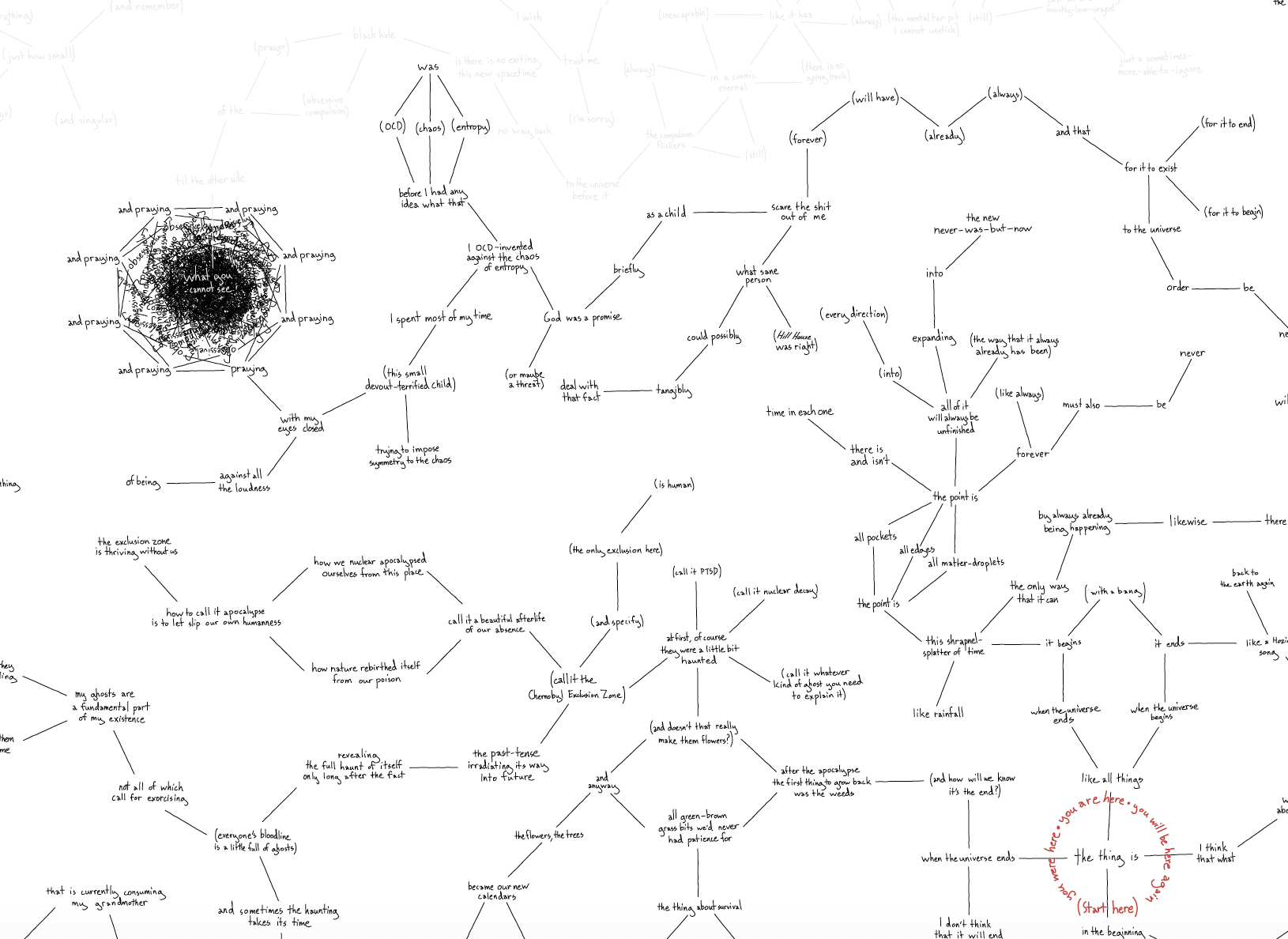 There is no fixed sequence or linearity to the radiating textual pathways—rather, I invite readers to begin at (and return to) the central point again and again as they create their own chronology of the chaos, each experiencing it just slightly different from anyone else, such that the very act of reading the piece implicates the reader themself in the process of its collapse and re-creation.